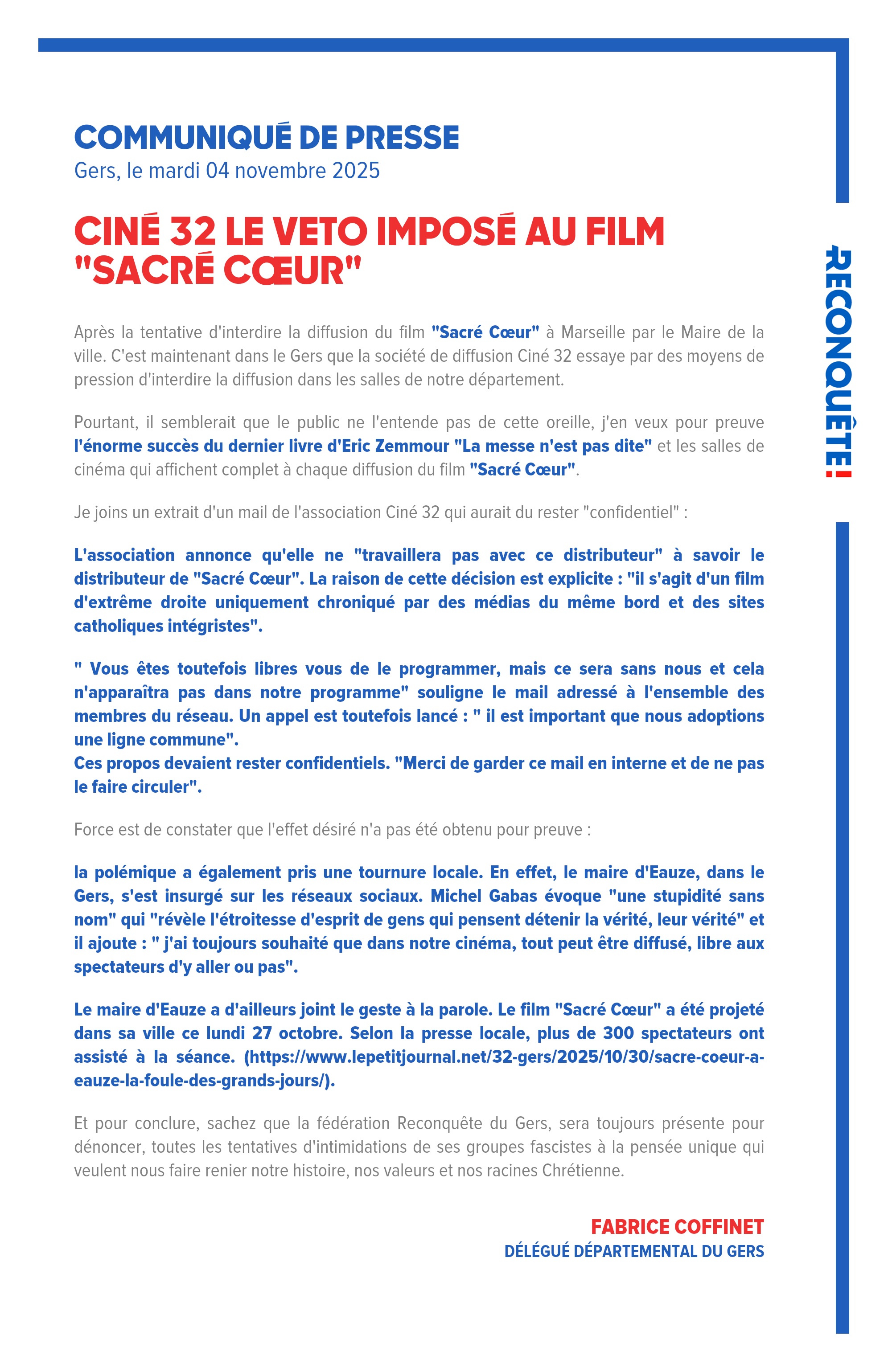 Le maire d'Eauze a d'ailleurs joint le geste à la parole. Le film "Sacré Cœur" a été projeté dans sa ville ce lundi 27 octobre. Selon la presse locale, plus de 300 spectateurs ont assisté à la séance. (https://www.lepetitjournal.net/32-gers/2025/10/30/sacre-coeur-a-eauze-la-foule-des-grands-jours/).